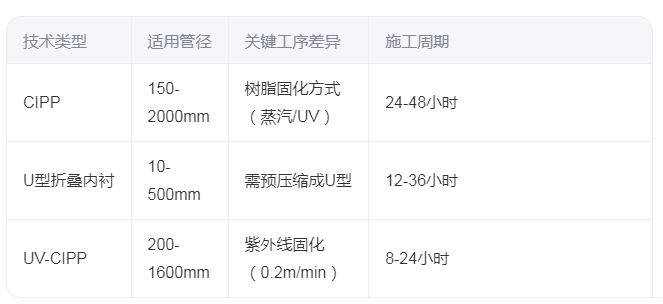 管道非開挖內(nèi)襯修復(fù)技術(shù)因其高效、環(huán)保等特點(diǎn),已成為現(xiàn)代城市管網(wǎng)維護(hù)的主流方式。結(jié)合不同修復(fù)方法的特點(diǎn)整理而成: